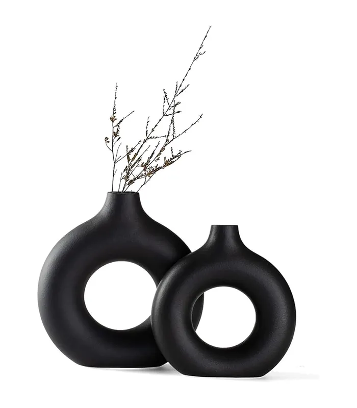 Sawoake Set of 2 Black Ceramic Donut Vases for Modern Home Decor
